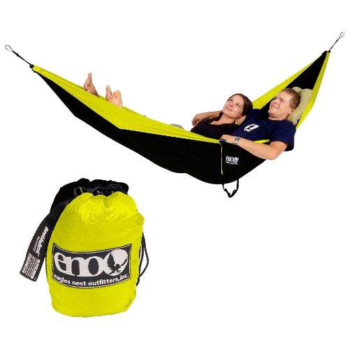 Nothing says relaxing like swinging in a hammock! The ENO DoubleNest Hammock is perfect for the boater and camper - lightweight, compact, durable. And it's big enough to share! You can get close to each other, while you get close to nature. ENO's DoubleNest hammock makes you want to snuggle. With two and a half additional feet of width, the DoubleNest hammock allows plenty of room for as many people as you choose. So have fun with it and utilize the 400lb. weight capacity. The Double-Nest seats more than one person comfortably and is essential for family adventures. The DoubleNest still packs down to the size of a grapefruit, so there is no excuse to be without your ENO hammock.